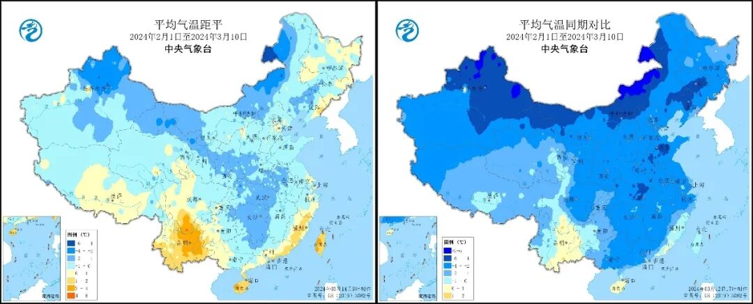 图3. 2024年2月至3月上旬平均气温与常年(左)和2023年(右)同期对比