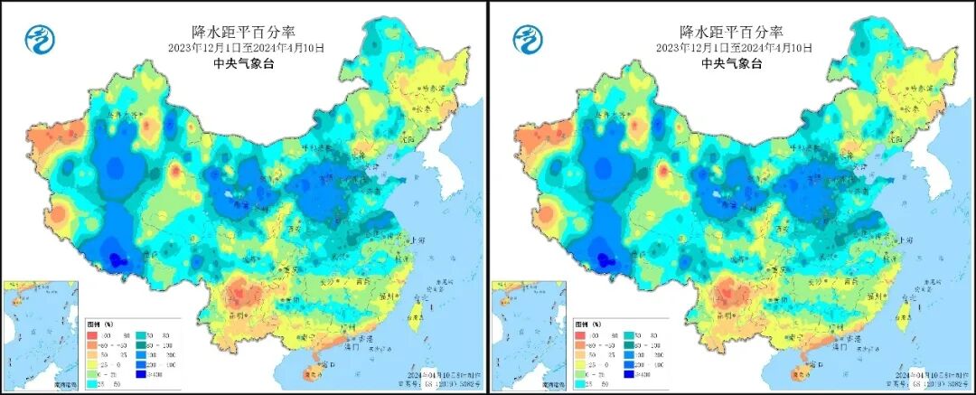 图1. 2023年12月以来降水量与常年(左)和上一年(右)同期对比