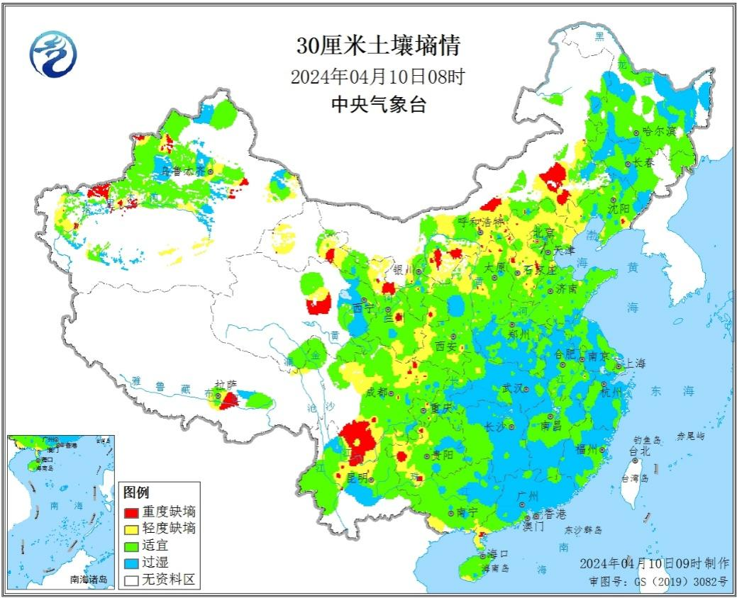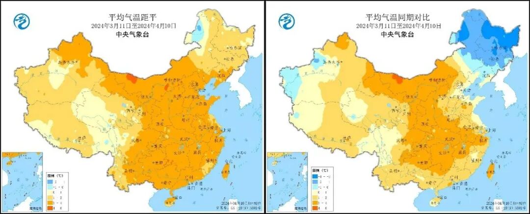 图4. 2024年3月11日—4月10日平均气温与常年(左)和2023年(右)同期对比
