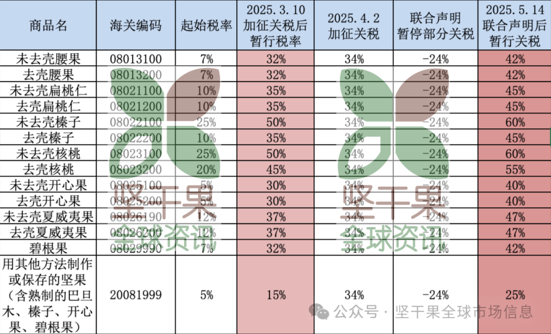 上述产品在原有税率基础上,享受24%的关税暂停加征90天,保留剩余10%的关税。关税调整后,美国进口坚果暂行关税在25%-60%之间,其中未去壳榛子和核桃关税最高(60%),用其他方法制作或保存的坚果(含熟制的巴旦木、榛子、开心果、碧根果)关税最低(25%)。